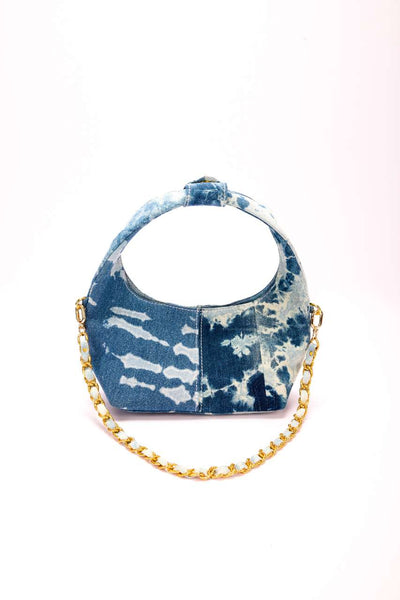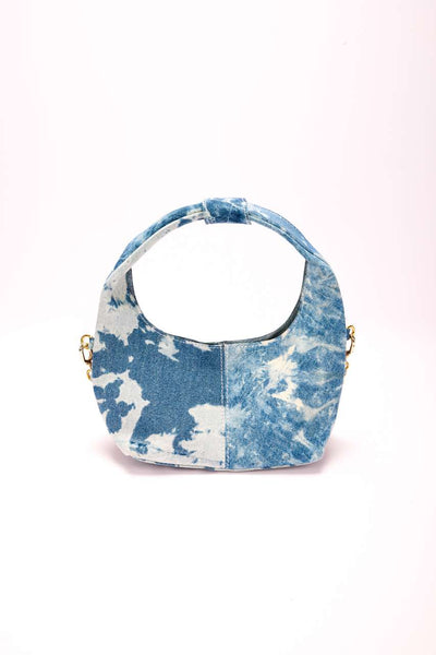 Crafted from up-cycled denim fabric, it features a striking texture that gives it a distinctly edgy and artistic flair. The bag's silhouette is soft and curved, with a compact yet roomy body that hugs close to the side when carried. On each side, there are small gold-tone D-rings for attaching an optional crossbody strap, adding versatility to its design.