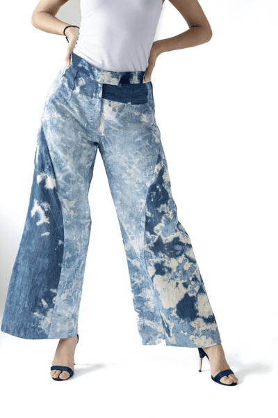 This one-of-a-kind silhouette was created by layering three different types of denim bleached to create this lovely texture. The patched pockets with gold accents make it an intriguing piece.