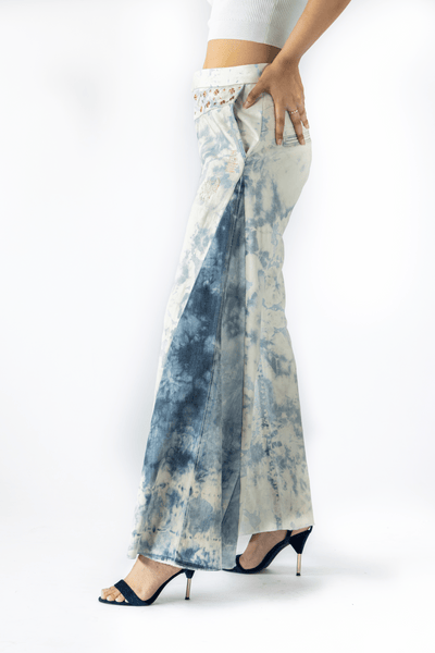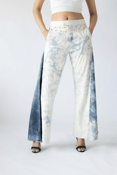 The perfect amalgamation of aesthetic & ethical fashion. The ‘Diploid Denim Pants’ pants aren’t your typical flared pants. We have used two separate shades of bleached denim & embellished them with gold stud detailing. This is what makes them unique & one of a kind.