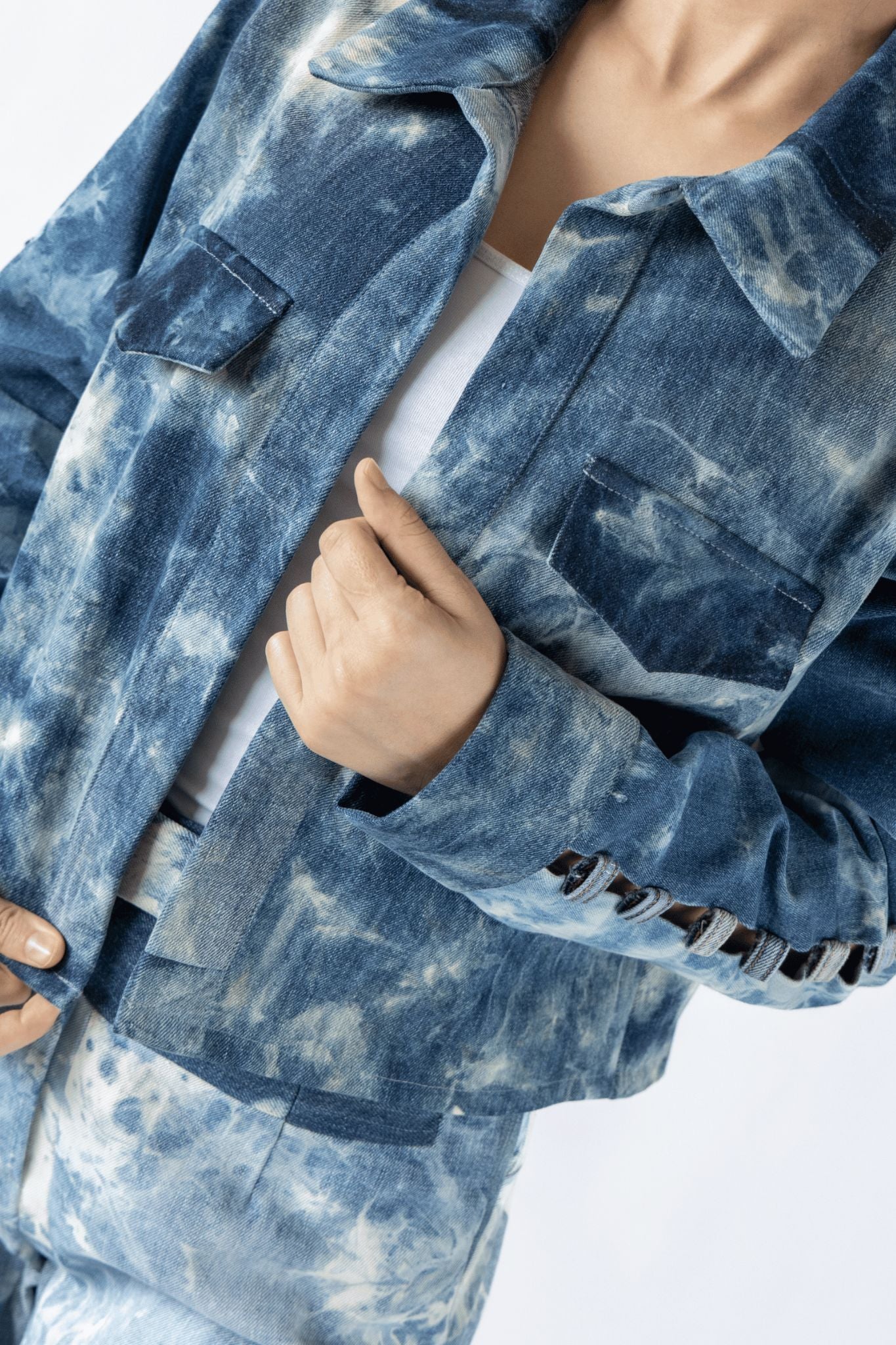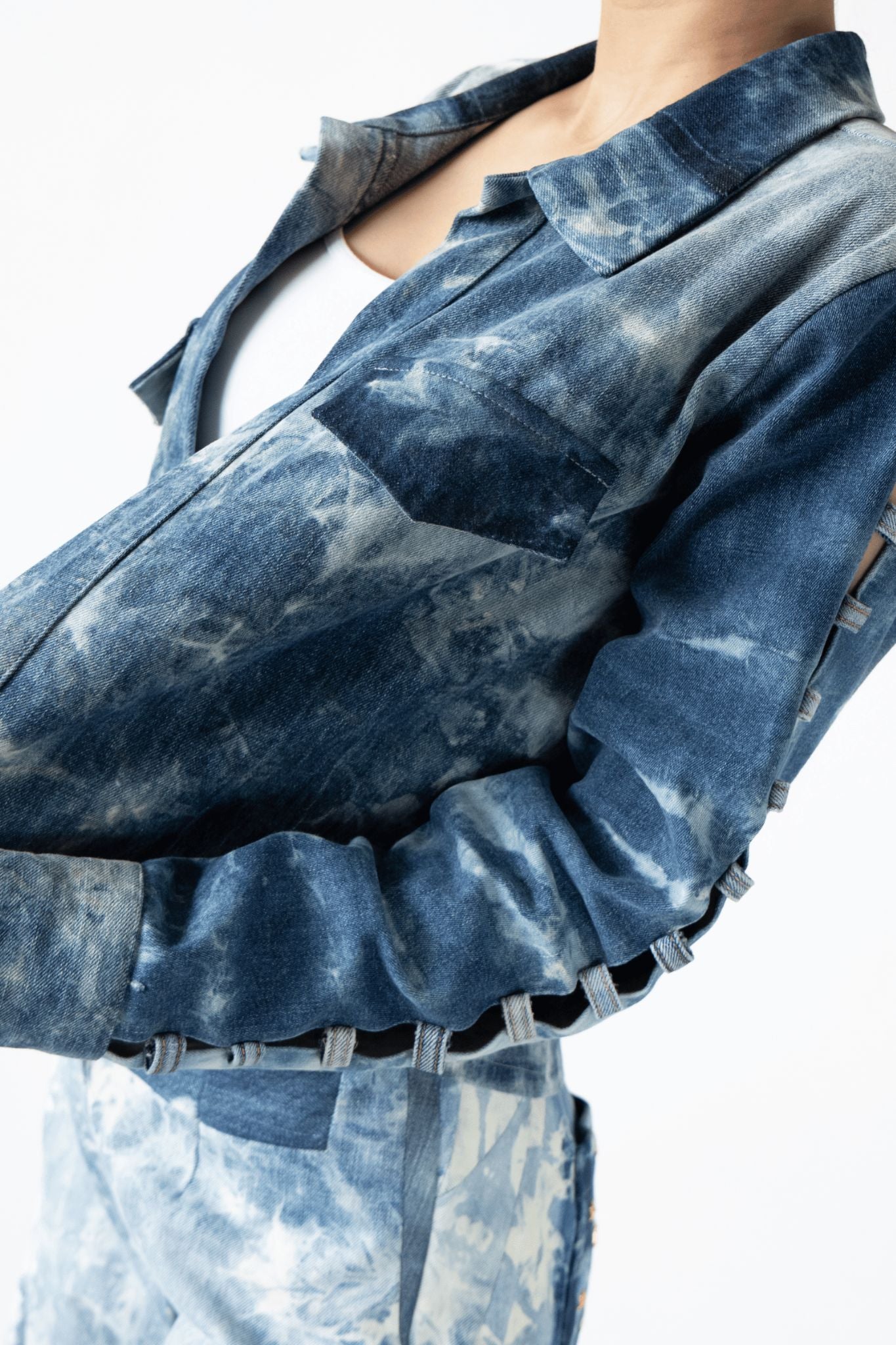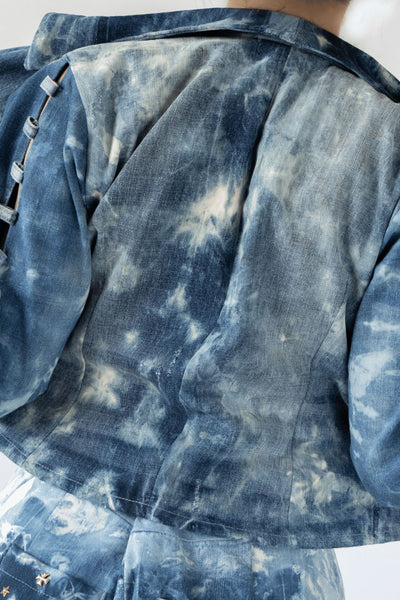 Yet another attempt at ‘repurposing belt loops from old denims’. This Jacket was crafted using three different denims having washed bleached & sanitized them. The piece however stands out for its little window detailing on the sleeves created by repurposing denim loops from old denims.