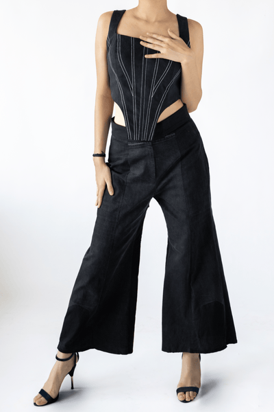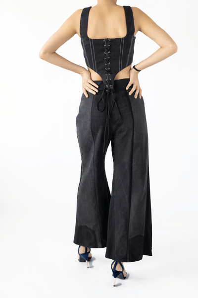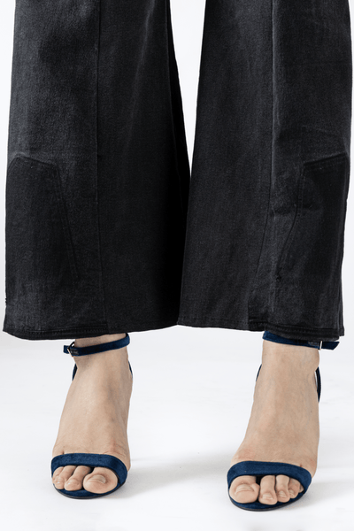 Flared pants but with an ethical twist. Having up-cycled 4 different pairs of black denim is what gives these bottoms their unique 2 tone shade. The Pocket patch detailing around the hem is what adds to the authenticity of upcycling.